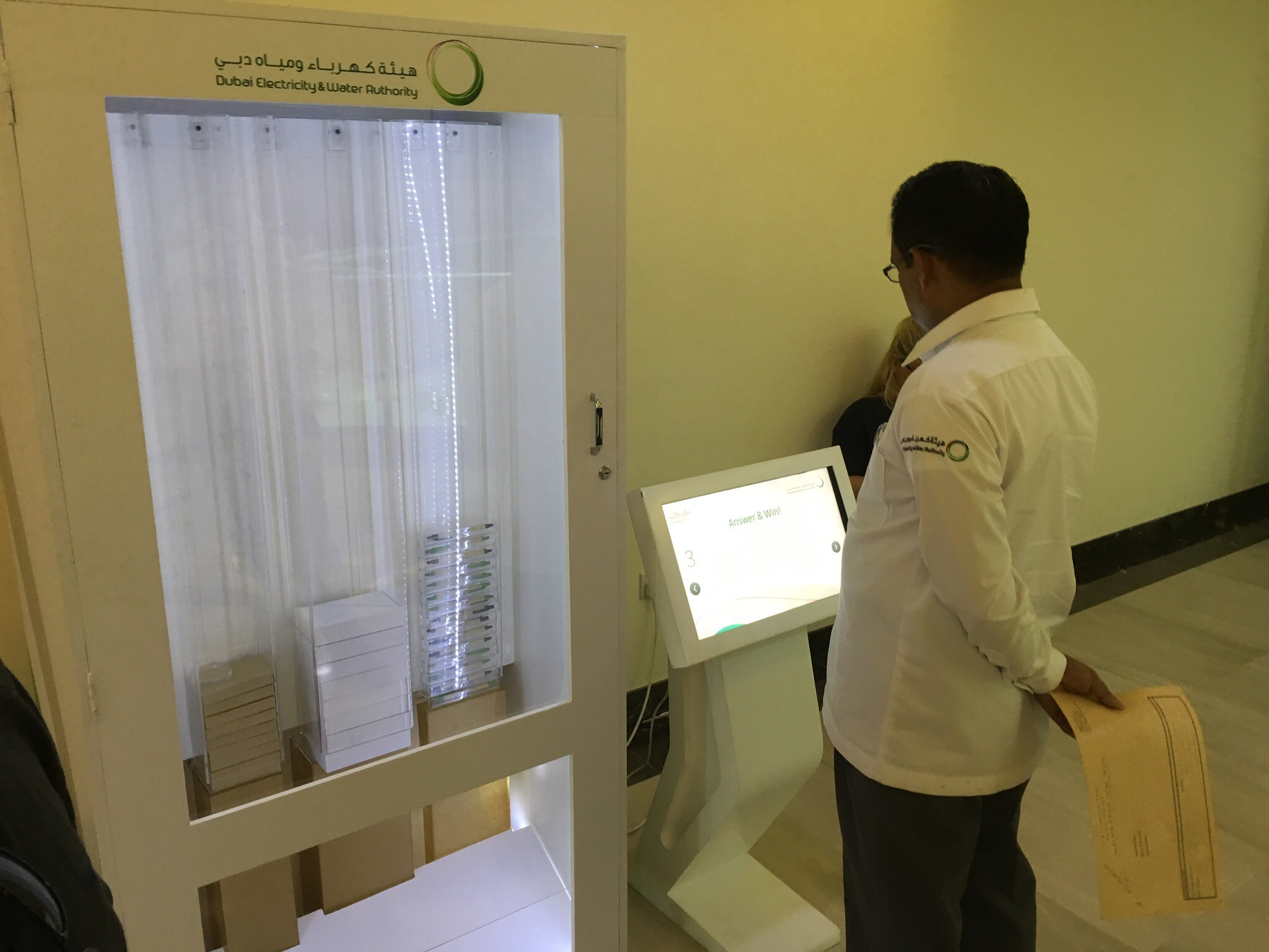 DEWA transformed employee engagement by turning environmental education into a rewarding challenge. We developed a custom vending machine that integrated a touch-screen quiz focused on sustainability. Employees who answered three out of five questions correctly received immediate, eco-friendly rewards.