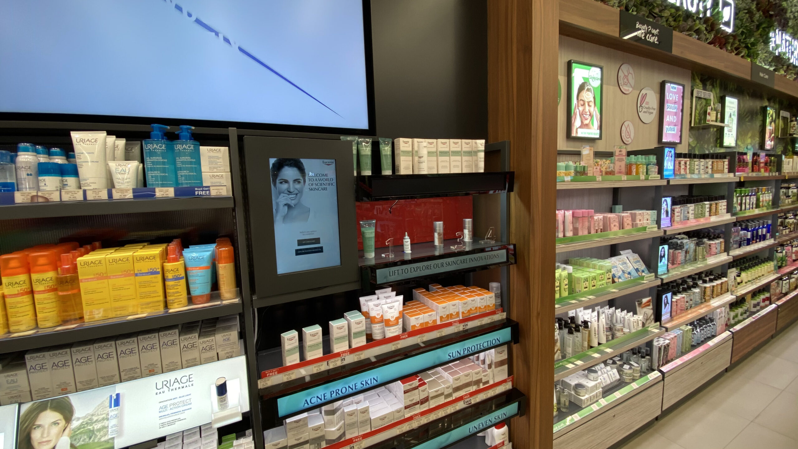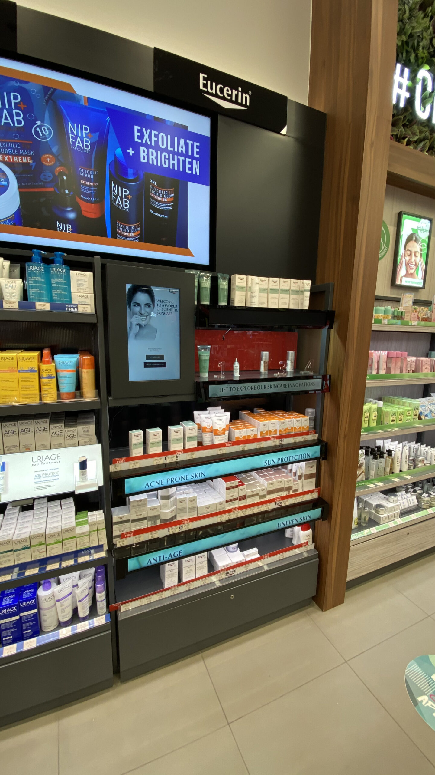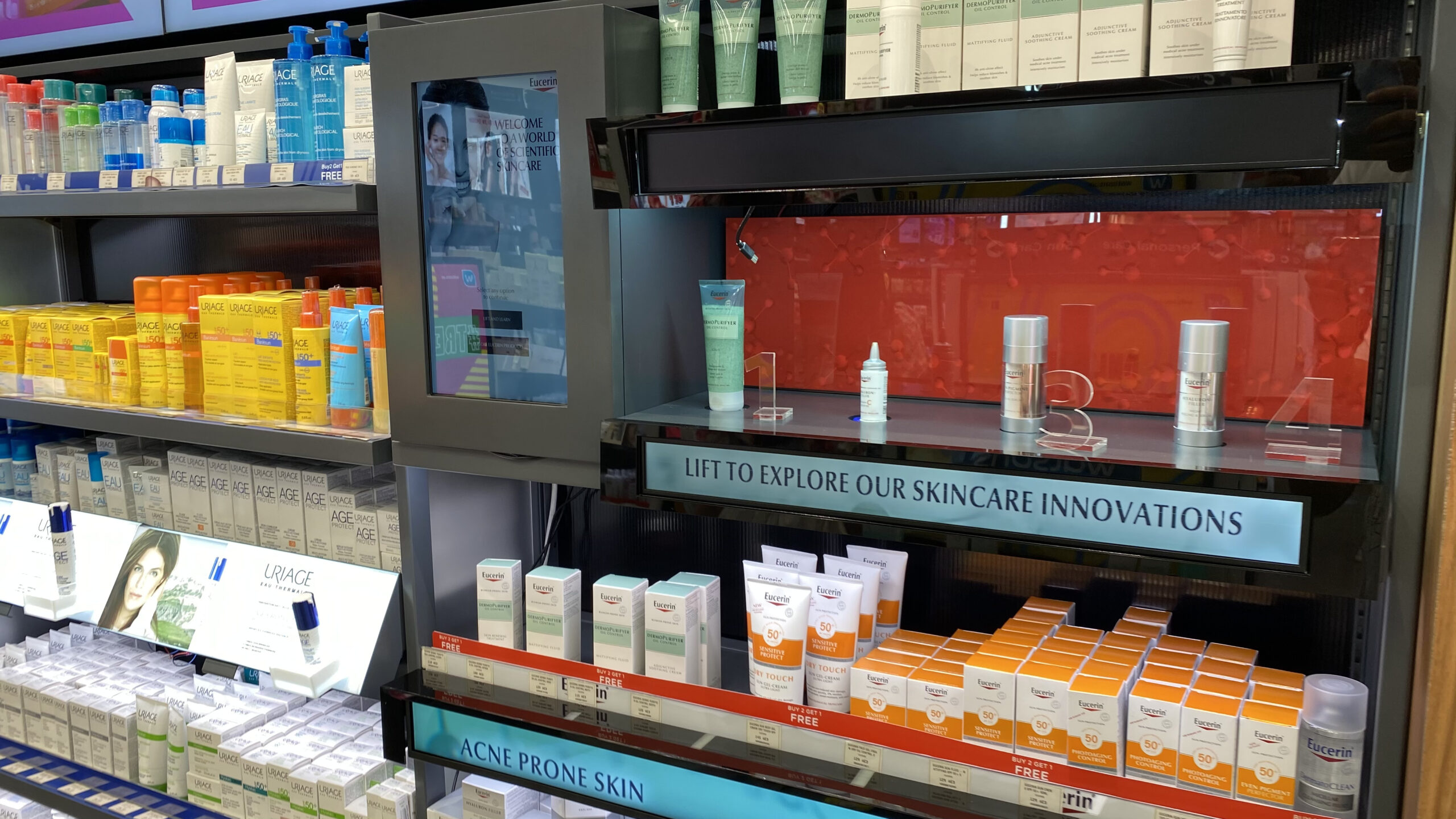 Static shelves often fail to hold shoppers’ attention in a crowded pharmacy. For Eucerin’s pop-up displays at Dubai Festival City and Mall of the Emirates, we bridged the gap between physical touch and digital education. By integrating a “Lift and Learn” system with a custom interactive UI, we turned simple product browsing into a high-tech discovery journey.