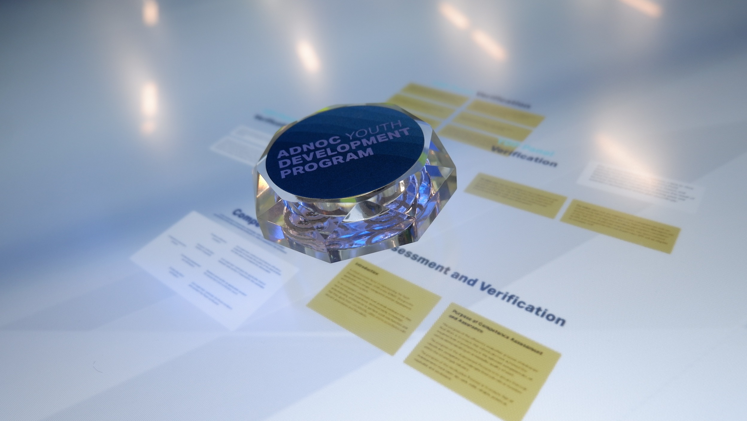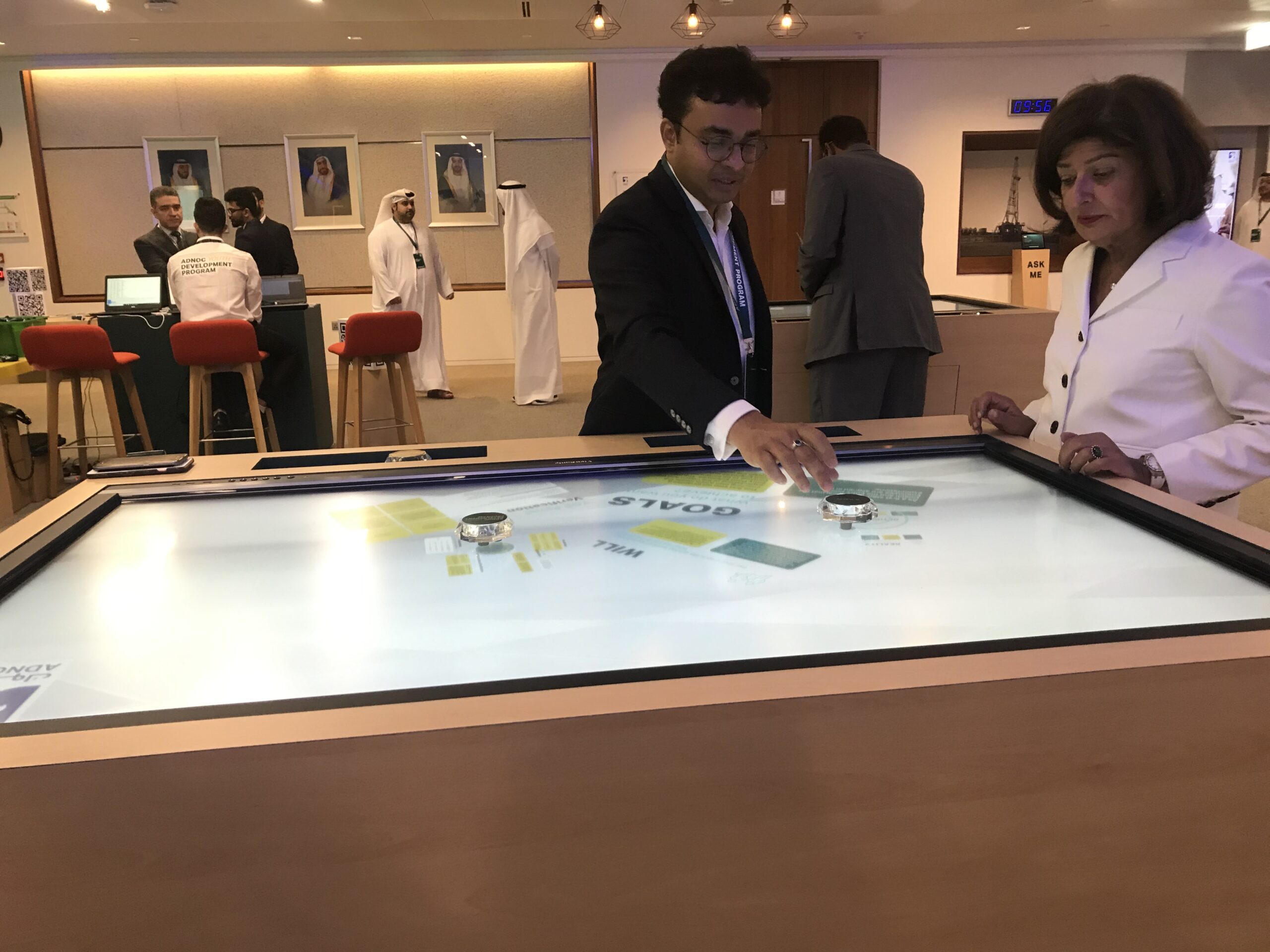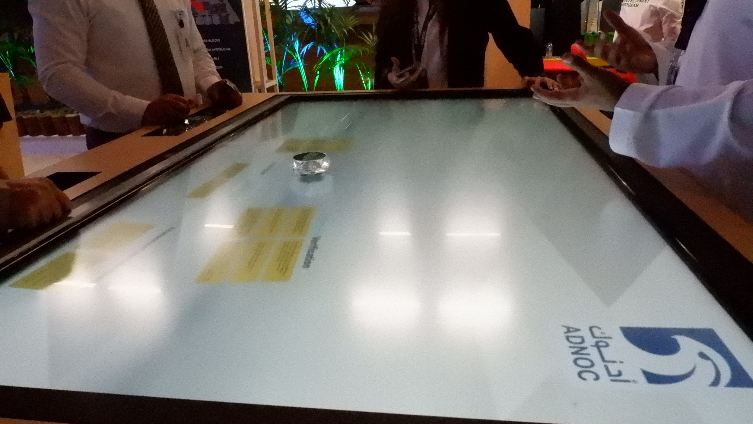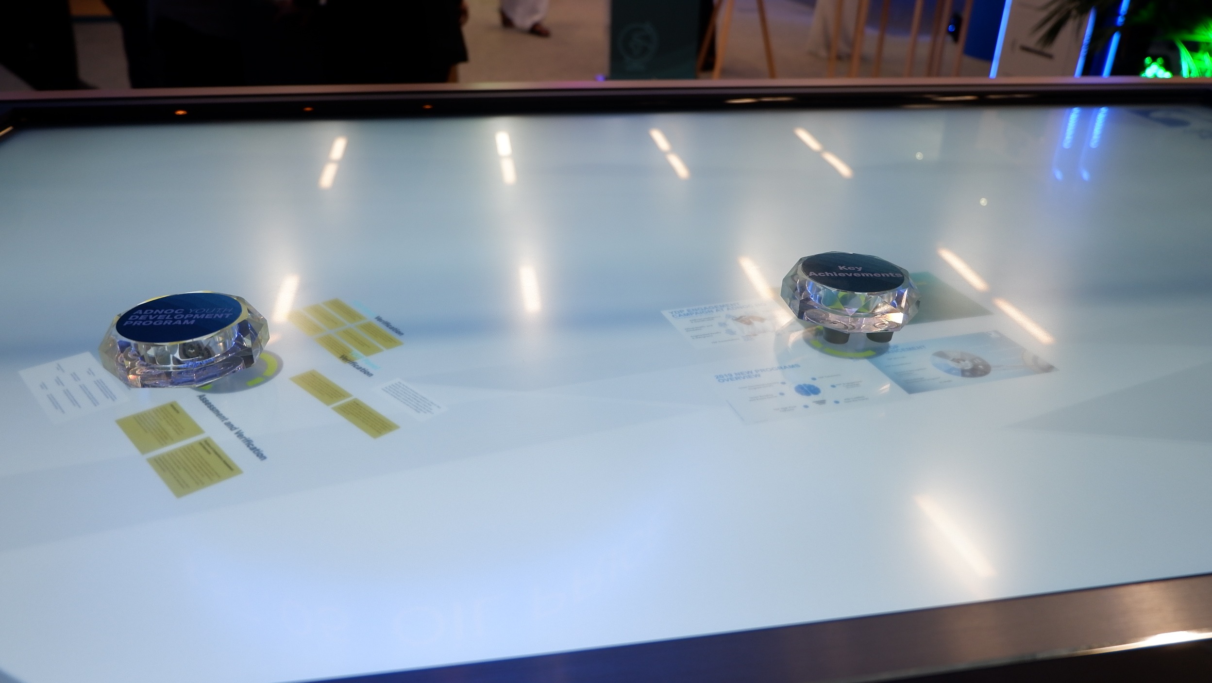 PearlQuest transformed theoretical concepts into a tactile experience for ADNOC using a custom-built 65-inch multi-touch table. We engineered a seamless interface in which physical glass objects served as digital keys. When an attendee placed a labeled object on the surface, the table immediately identified it and launched targeted videos and high-resolution imagery.