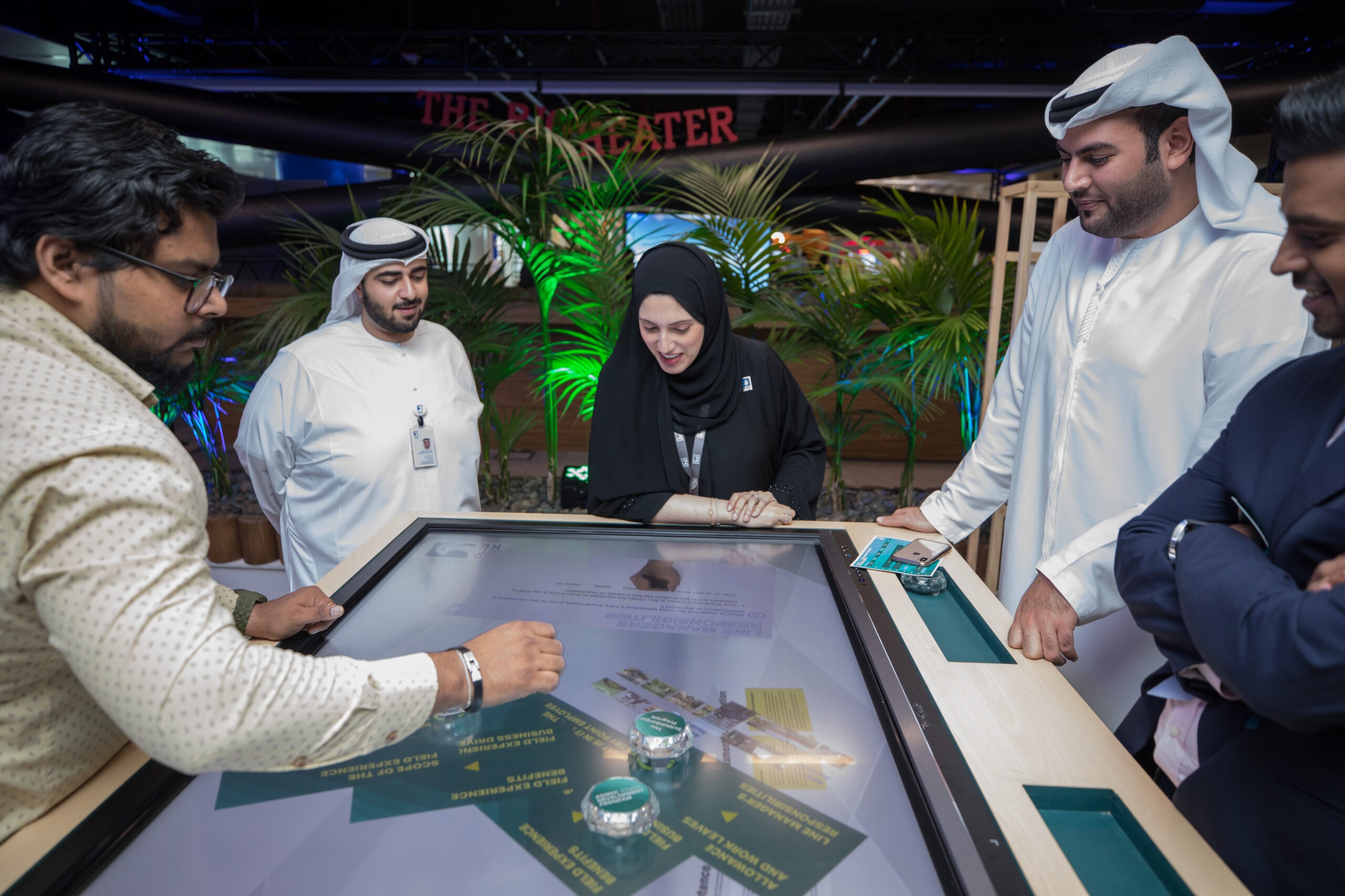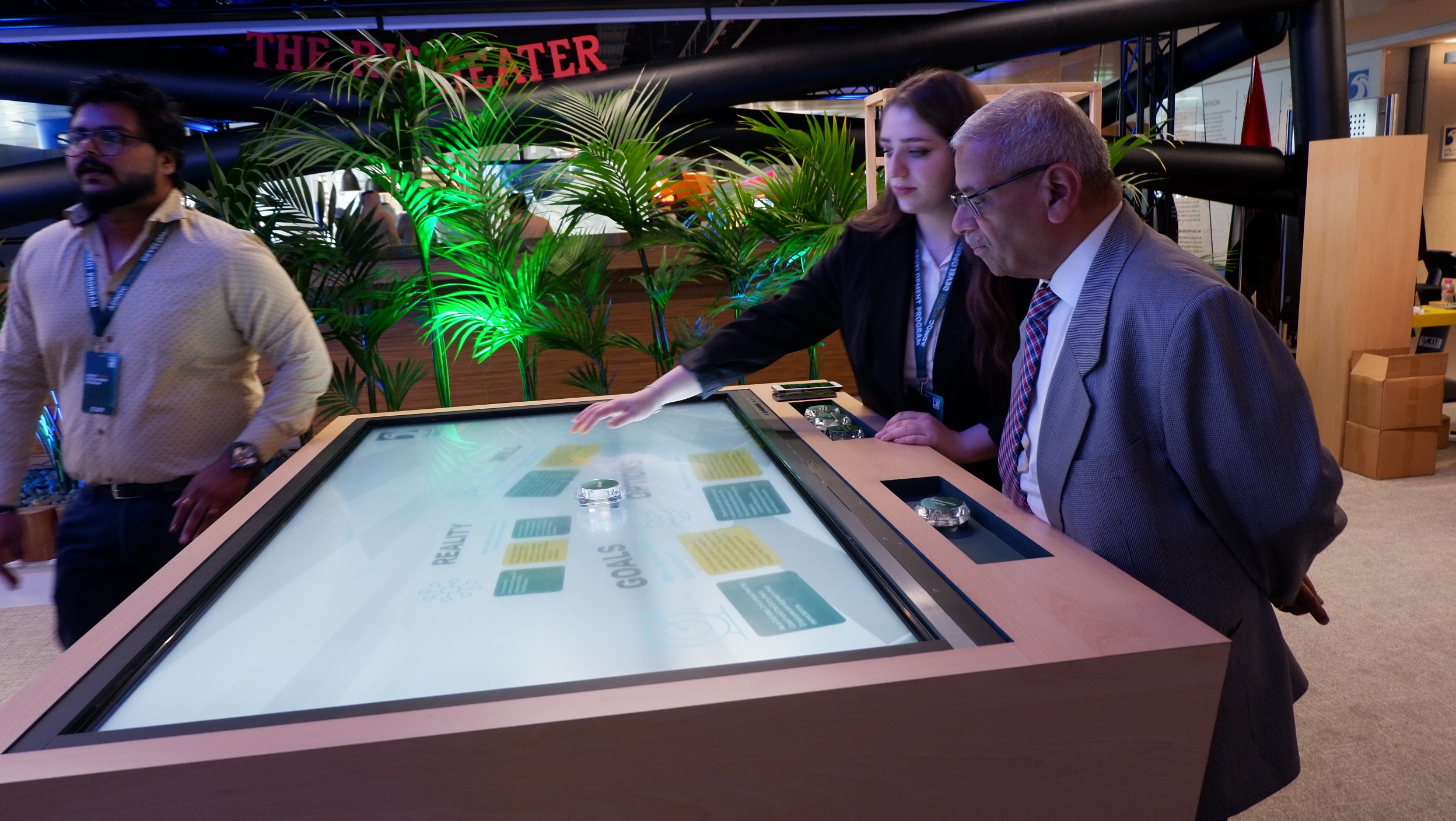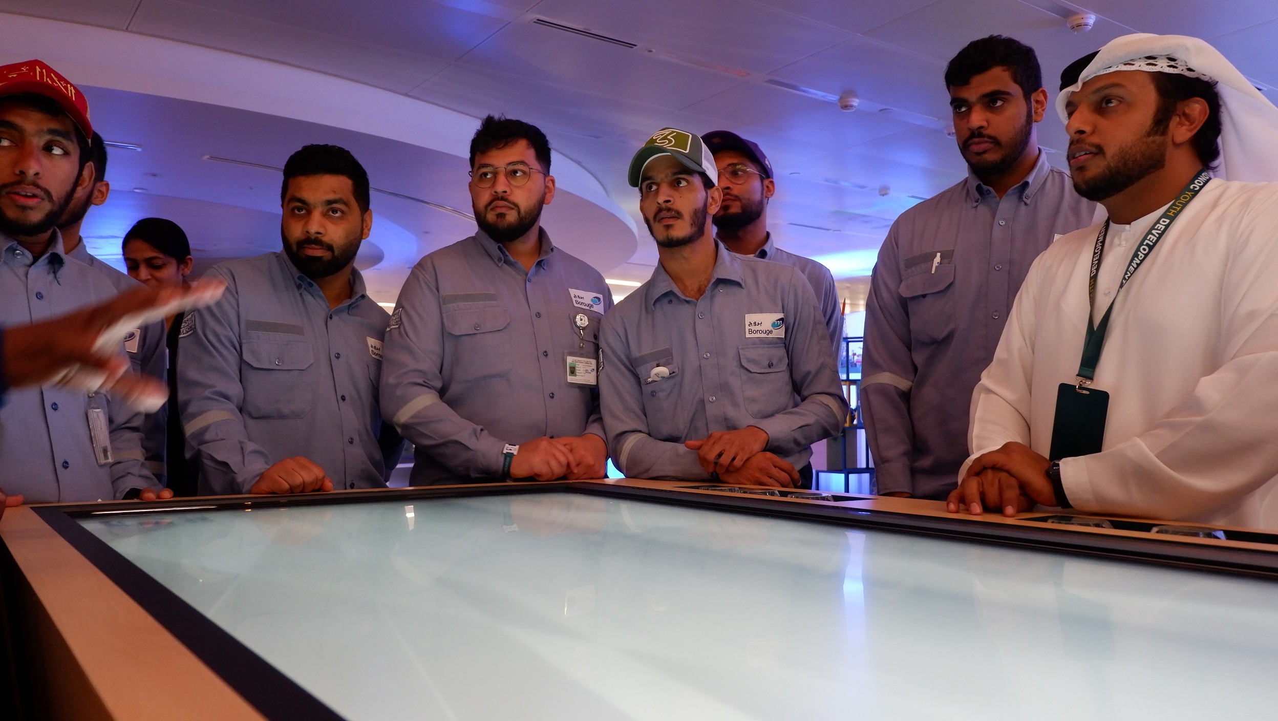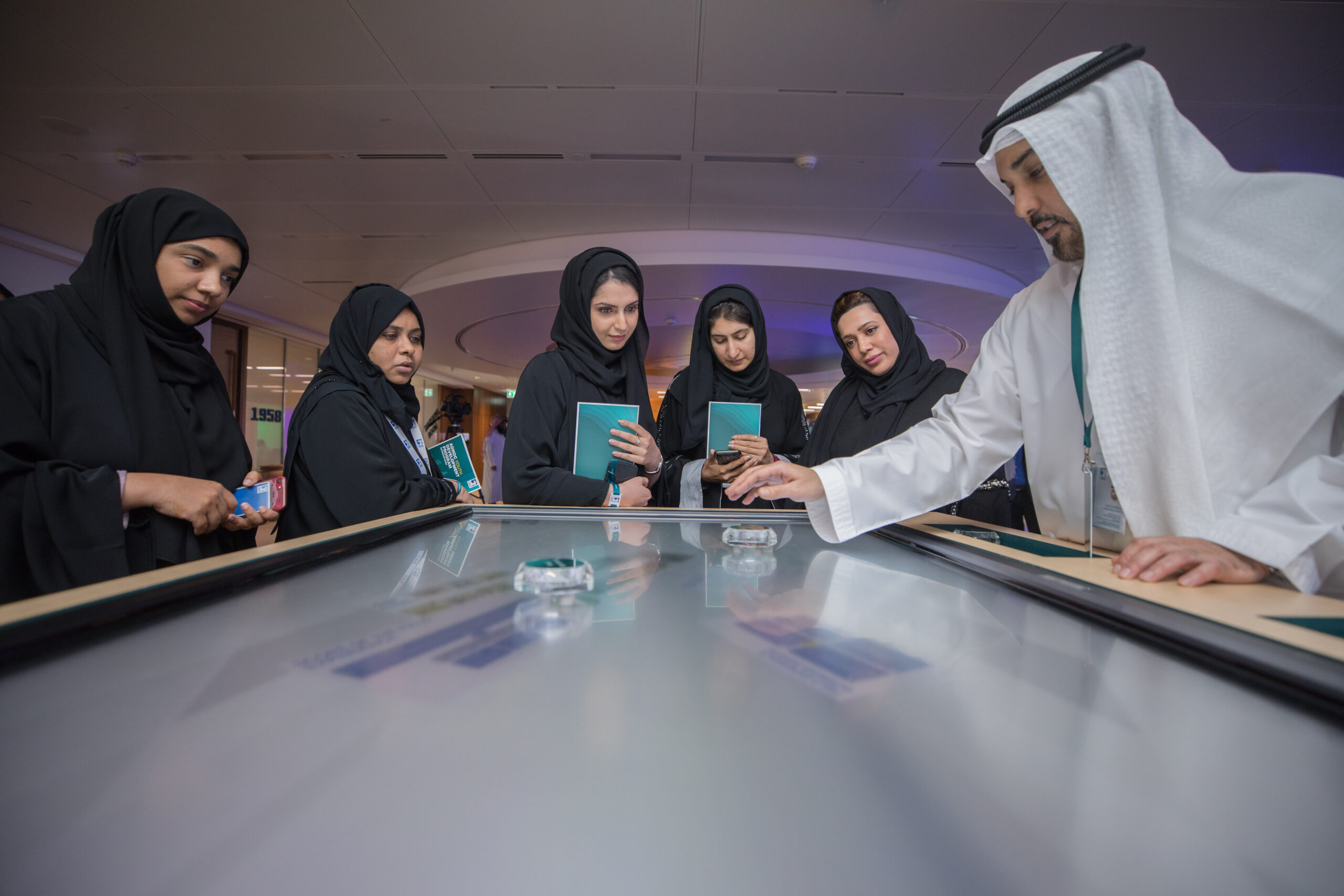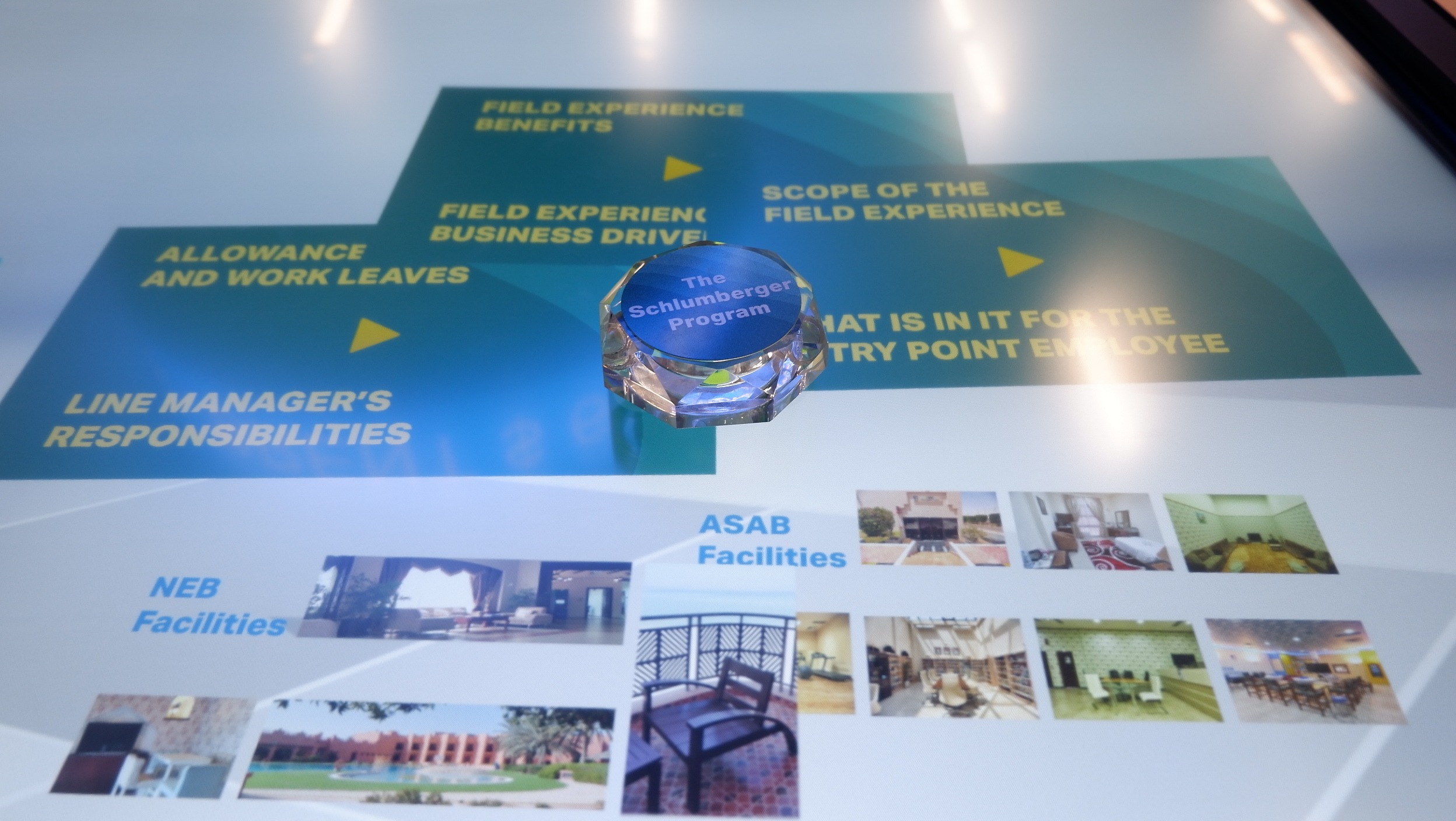 PearlQuest transformed theoretical concepts into a tactile experience for ADNOC using a custom-built 65-inch multi-touch table. We engineered a seamless interface in which physical glass objects served as digital keys. When an attendee placed a labeled object on the surface, the table immediately identified it and launched targeted videos and high-resolution imagery.