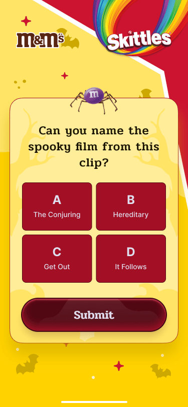 M&M’s turned the spooky season into a high-engagement event with a custom-built digital trivia experience. Your audience watched atmospheric movie clips and tested their horror film knowledge to unlock a thrilling lucky draw. This interactive mechanic transformed passive viewers into active participants, keeping the brand top-of-mind throughout the Halloween period.